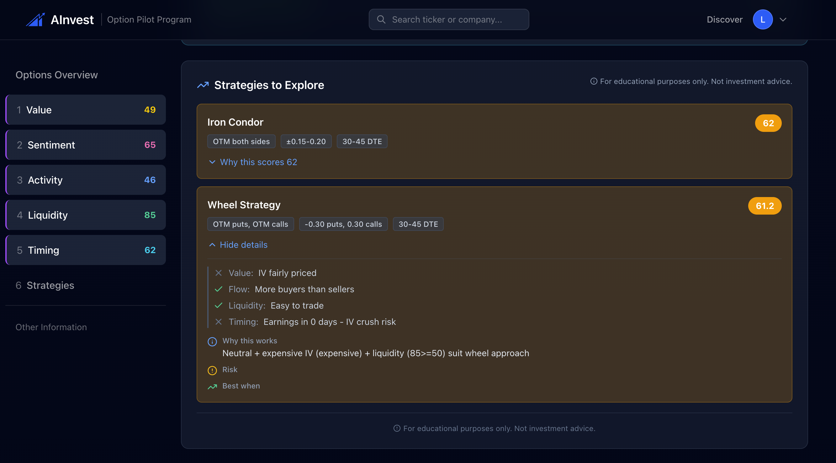 The strategy panel showed Iron Condor bias (score: 62), which profits from range-bound outcomes — and the stock ultimately went nowhere.
