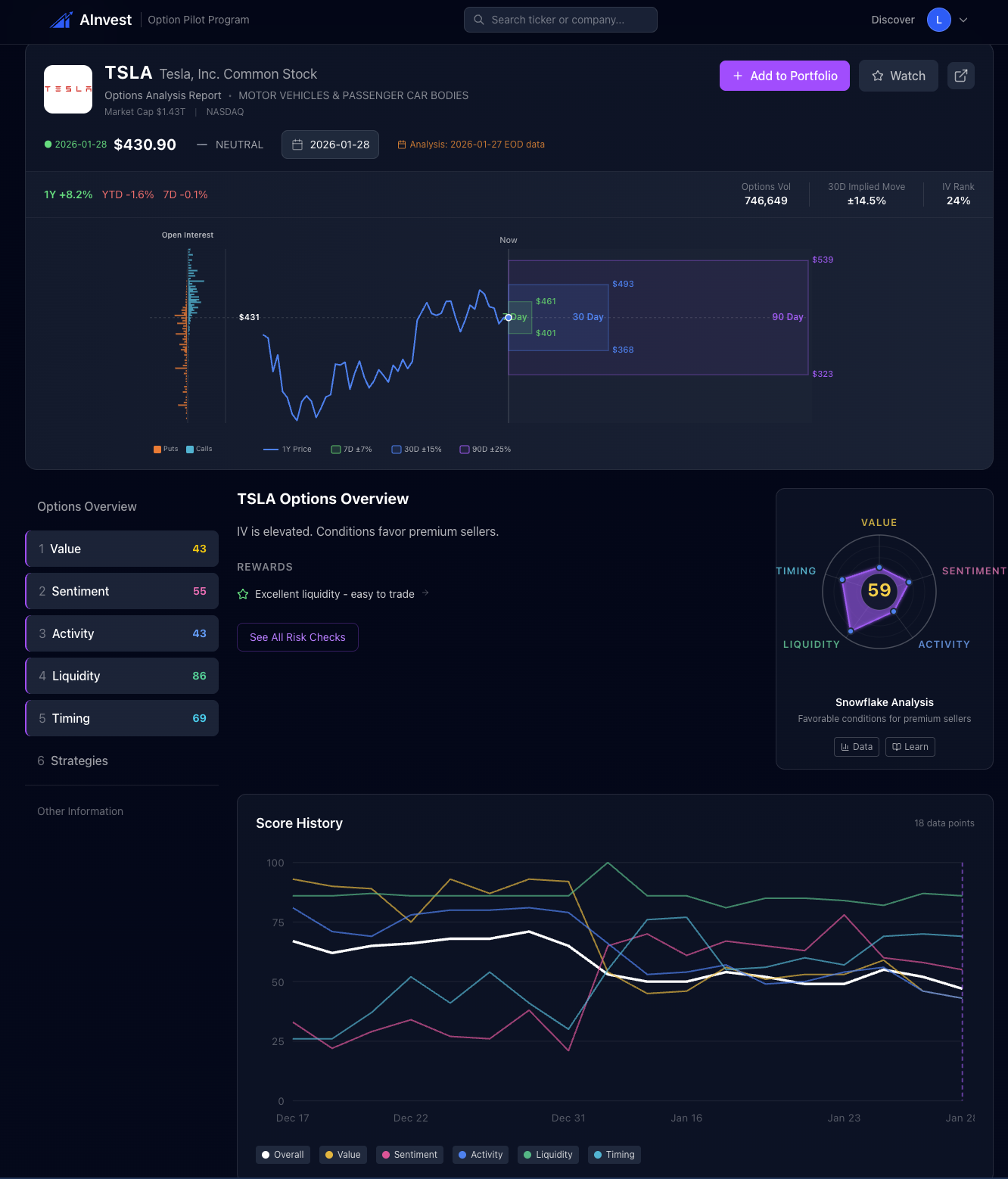 The Liquidity score of 31 was a clear warning: IBM's options spreads are wider than mega-cap peers. Trading costs would eat into any strategy. The Timing score of 8 was the lowest of all four stocks, correctly flagging that earnings were imminent.
