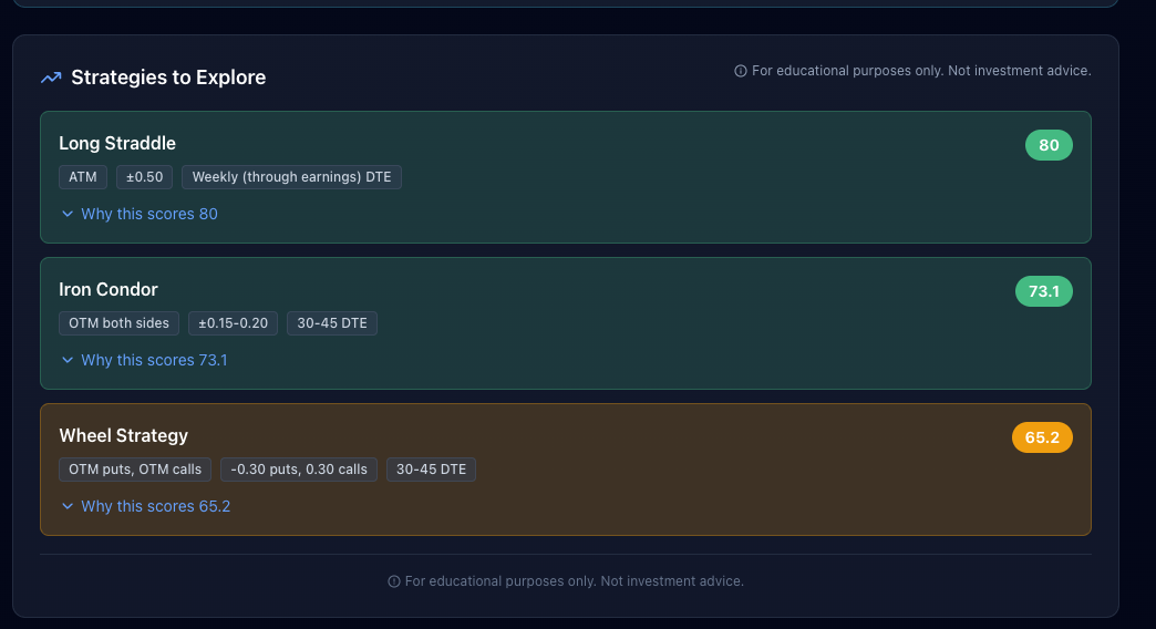 The top strategy bias was Long Straddle (score: 80), which profits from a large move in either direction. Given elevated IV and imminent earnings, the system identified that conditions favored a big move.