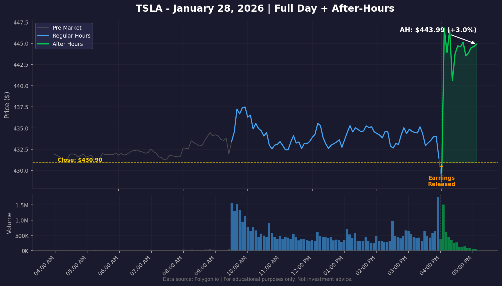 TSLA moved +3.0% after hours but settled back to $431.46 by the next day.